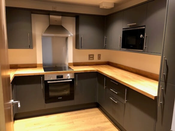All kitchen units, worktops, and appliances destroyed.